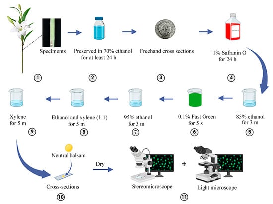 Three stem specimens were excised at anthesis with 3 cm long at upper region as biological replicates. Firstly they were fixed in 70% ethanol (Tianjin Damao Chemical Reagent Co., Ltd., Tianjin, China, 24 h, room temperature), and processed for freehand sectioning. Sections were sequentially stained with 1% Safranin O (Coolaber, Beijing, China, 24 h), rinsed in 85% ethanol (3 min), counterstained with 0.1% Fast Green FCF (Coolaber, Beijing, China, 5 s), dehydrated through an ethanol–xylene (Tianjin Fuyu Fine Chemical Co., Ltd, Tianjin, China) series (95% ethanol, 3 min; ethanol:xylene = 1:1, 5 min; pure xylene, 5 min), and mounted in neutral balsam (Coolaber, Beijing, China). Imaging was performed using light microscope (Olympus CX33, Olympus, Nagano Prefecture, Japan) and stereomicroscope (Olympus SZX16, Olympus, Nagano Prefecture, Japan) coupled with MShot Image Analysis System (V1.1.4_MSH12, Guangzhou Mingmei Optoelectronic Technology Co., Ltd., Guangzhou, China) and DP Controller 75 (Ver.21, Olympus, Nagano Prefecture, Japan). Workflow details are schematized in Figure 1.