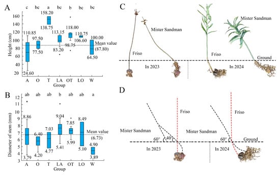 For vertical planting, ‘Friso’ stems grew perpendicular to the soil, while ‘Mister Sandman’ stems initially emerged at a 40° angle and later inclined to 60° (Figure 2C,D). Under horizontal planting, ‘Friso’ stems bent twice to achieve vertical growth, whereas ‘Mister Sandman’ stems curved upward underground and maintained a 60° angle after emergence (Figure 2C,D). Additionally, ‘Mister Sandman’ developed more stem roots than ‘Friso’ (Figure 2C).