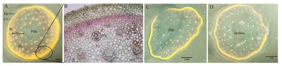 The following quantitative traits were assessed: stem cross-section area (S, mm2), cuticle thickness (μm), Ep L/W ratio (μm/μm), cortex/sclerenchyma thickness (Cx/Sr ratio, μm/μm), Vb density (calculated as the total number of Vbs divided by stem cross-sectional area, No./mm2), Vb component (xylem (Xy), phloem (Ph), vessels (Ve) and xylem parenchyma (Xp)) areas (μm2). These stem cross-sections were radially divided into 16 equal sectors and four opposing 1/16 regions—totaling 25% of the S—were selected [11]. These parameters were measured using ImageJ software (V1.53t, National Institutes of Health, Bethesda, MD, USA).