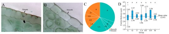 The cuticle, located on the Ep’s outer surface, exhibited two primary textures: sinuate (64.79%) and smooth (35.21%) (Figure 4A,B). Smooth cuticles were predominant in LO, O and most OT hybrids, while sinuate cuticles were common in wild species, T hybrids and most A and LA hybrids (Figure 4C). The cuticle thickness ranged from 1.45 µm (‘Navona’) to 4.16 µm (‘Secret kiss’), averaging 2.65 µm (CV = 18.49%) (Figure 4D). No significant differences in the cuticle thickness were observed among Lilium groups (p > 0.01).