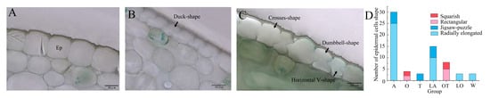 Epidermal cells displayed diverse shapes, including radically elongated (61.97%, Figure 4A), rectangular (9.86%, Figure 4B), squarish (7.04%, Figure 5A) and jigsaw-puzzle forms (21.13%), resembling ducks, dumbbells, crosses, or horizontal V shapes (Figure 5B,C). Jigsaw-puzzle cells were prevalent in A, T and LA hybrids. Rectangular and squarish cells were rare, primarily observed in O and OT hybrids (Figure 5D).