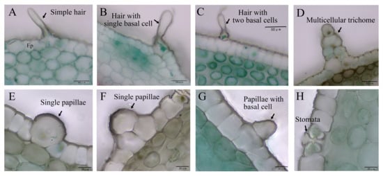 Trichomes, papillae and stoma. (A) ‘Bazin’, simple hair. (B) ‘Eyeliner’, hair with single basal cell. (C) ‘Forever Susan’, hair with two basal cells. (D) L. lancifolium, multicellular trichome. (E,F) ‘Matrix’, single papillae. (G) ‘Forever Susan’, papillae with basal cell. (H) ‘Bazin’, xerophytic sunken stomata. Ep, epidermal cells. Scale bar: (A–D)—50 μm; (E–H)—20 μm.