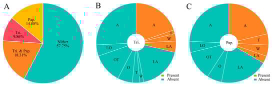 Distribution of trichomes and papillae across lily groups. (A) Frequency distribution of epidermal appendages: trichome-papillae co-occurrence, exclusive trichomes, exclusive papillae, and absence. (B) Distribution of trichomes across lily groups. (C) Distribution of papillae across lily groups. Tri., trichomes; Pap., papillae; A, Asiatic hybrids; O, Oriental hybrids; T, Trumpet hybrids; LA, Longiflorum × Asiatic hybrids; OT, Oriental × Trumpet hybrids; LO, Longiflorum × Oriental hybrids; W, wild species.