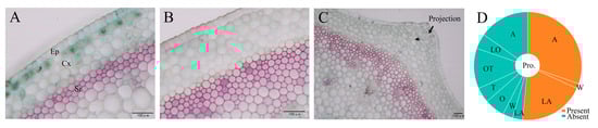 Cortical characteristics in lily groups. (A) ‘Sweet Vally’, 4–5 layers of cortical cell arranged tightly. (B) ‘Cali’, 5–6 layers of cortical cell arranged moderately. (C) ‘Corallo Beach’, projection. (D) Distribution of projection across lily groups. Ep, epidermal cells; Cx, cortex; Sr, sclerenchymatous ring; Pro., projection; A, Asiatic hybrids; O, Oriental hybrids; T, Trumpet hybrids; LA, Longiflorum × Asiatic hybrids; OT, Oriental × Trumpet hybrids; LO, Longiflorum × Oriental hybrids; W, wild species. Scale bar: (A–C)—100 μm.