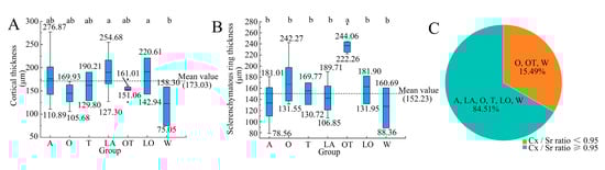Cortex and sclerenchymatous ring thickness with their ratio in lily groups. Boxplots of the thickness of cortex (A) and sclerenchymatous rings (B) across lily groups. (C) Distribution of Cx/Sr ratio across lily groups. A, Asiatic hybrids; O, Oriental hybrids; T, Trumpet hybrids; LA, Longiflorum × Asiatic hybrids; OT, Oriental × Trumpet hybrids; LO, Longiflorum × Oriental hybrids; W, wild species. Black dots indicate outliers. Different lowercase letters indicate significant differences (Duncan’s Multiple Range test, p < 0.01).