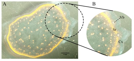 Distribution of vascular bundles in ‘Apricot Fudge’: overall vascular bundles distribution (A) and magnified view of peripheral vascular bundles extending into the cortex (B). Cx, cortex; Sr; sclerenchymatous rings; Vb, vascular bundles. Scale bar: 1 mm.