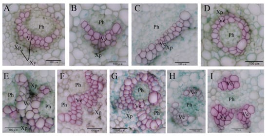 The various vascular bundles shapes. (A) ‘Mister Sandman’, U-shaped. (B) ‘Mister Sandman’, V-shaped. (C) ‘Corallo Beach’, I-shaped. (D) ‘Mister Sandman’, O-shaped. (E) ‘Sweet Zanica’, X-shaped. (F) ‘Easy Waltz’, W-shaped. (G) ‘Easy Waltz’, Q-shaped. (H) ‘Bright Diamond’, co-xylem consisting of two separated xylems. (I) ‘Easy Waltz’, co-xylem consisting of three separated xylems. Ph, phloem; Ve, vessel; Xp, xylem parenchyma; Xy, xylem. Scale bar: 100 μm.