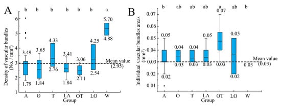 Boxplots of the density of vascular bundles (A) and the individual vascular bundles areas (B) across lily groups. A, Asiatic hybrids; O, Oriental hybrids; T, Trumpet hybrids; LA, Longiflorum × Asiatic hybrids; OT, Oriental × Trumpet hybrids; LO, Longiflorum × Oriental hybrids; W, wild species. Black dots indicate outliers. Different lowercase letters indicate significant differences (Duncan’s Multiple Range test, p < 0.01).