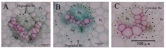 The Bs was composed of Pc and was nearly degraded in the examined cultivars, appearing fragmented on the phloem or on both the phloem and xylem sides, failing to form a complete circle (Figure 13A,B). In contrast, wild species retained a complete circular Bs (Figure 13C).