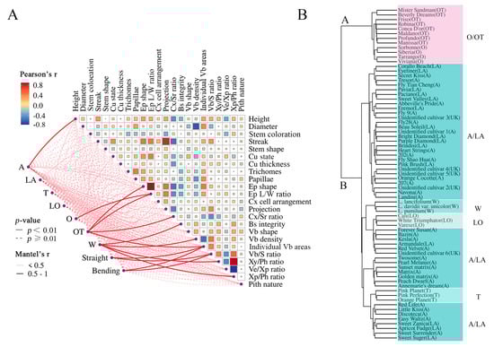 Correlation and cluster analysis based on 23 indices. (A) Pairwise comparisons of morphological and anatomical characteristics, with a color gradient denoting Pearson’s correlation coefficients. The Mantel’s tests were used to assess the correlations between lily groups, stem susceptibility to bending, and the indices. Edge width corresponds to the Mantel’s r statistic for the corresponding distance correlations. (B) Genetic relationship of 71 lilies based on 23 morphological and anatomical characteristics. A dendrogram was generated using ward.D method and Canberra distance. Group A was highlighted in purple, while group B in green. Cu, cuticle; Ep, epidermal cell; L, length; W, width; Cx, cortex; Sr, sclerenchymatous rings; Bs, bundle sheath; Vb, vascular bundles; S, stem cross-sectional area; Xy, xylem; Ph, phloem; Ve, vessel; Xp, xylem parenchyma; A, Asiatic hybrids; O, Oriental hybrids; T, Trumpet hybrids; LA, Longiflorum × Asiatic hybrids; OT, Oriental × Trumpet hybrids; LO, Longiflorum × Oriental hybrids; W, wild species.