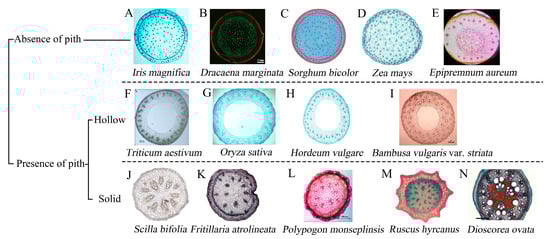 Classification of monocot stem cross-section anatomical characteristics based on within the pith-present group into solid or hollow pith. (A–E), absence of pith. (A) Iris magnifica [47]; (B) Dracaena marginata [37]; (C) Sorghum bicolor [48]; (D) Zea mays [49]; (E) Epipremnum aureum [42]. (F–I), presence of hollow pith. (F) Triticum aestivum [50]; (G) Oryza sativa [51]; (H) Hordeum vulgare [52]; (I) Bambusa vulgaris var. striata [53]. (J–N), presence of solid pith. (J) Scilla bifolia [22]; (K) Fritillaria atrolineata [40]; (L) Polypogon monseplinsis [54]; (M) Ruscus hyrcanus [55]; (N) Dioscorea ovata [43].