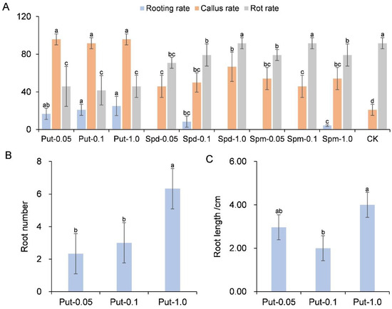 - Matam, P.; Parvatam, G. Putrescine and polyamine inhibitors in culture medium alter in vitro rooting response of Decalepis hamiltonii Wight&Arn. Plant Cell Tiss. Org. 2017, 128, 273–282. [Google Scholar]