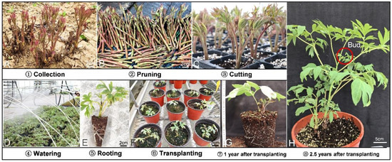 - Chen, C. Study on the Cutting Rooting and Stem Anatomical Structure Development of Tree Peony. Master’s Thesis, Beijing Forestry University, Beijing, China, 2019. [Google Scholar]