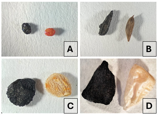 Seeds without seed coating (right) and seeds coated with biochar and buffalo digestate (left). (A) D. tenuifolia, (B) L. sativa, (C) S. lycopersicum, (D) Z. mays. Images were acquired using a stereomicroscope at 10× magnification.