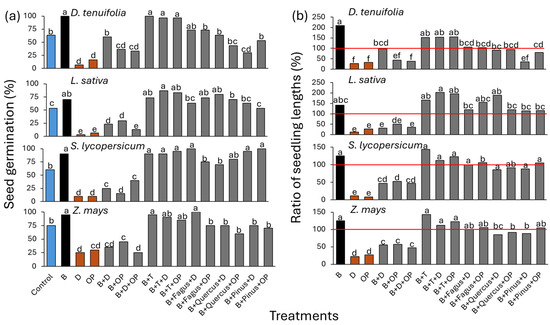 Seed germination (%) (a) and the ratio of seedling length relative to control (%) (b) of treated seeds with seed coatings in four species (D. tenuifolia, L. sativa, S. lycopersicum, and Z. mays). Different letters indicate statistically significant differences according to Tukey’s HSD test following ANOVA (p < 0.05); the red line indicates the control level. D: digestate; B: biochar; OP: olive pomace; T: T. harzianum. Fagus, Quercus, and Pinus refer to the addition of forest-derived natural microbiomes.