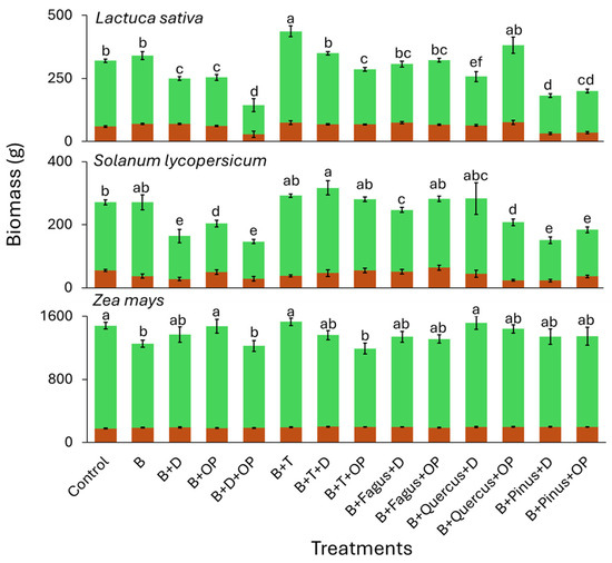Aerial (green) and root (brown) biomass from a field experiment on treated seeds with various seed coatings in L. sativa, S. lycopersicum, and Z. mays. Different letters indicate statistically significant differences according to Tukey’s HSD test following ANOVA (p < 0.05). D: digestate, B: biochar, OP: olive pomace, T: Trichoderma harzianum. Fagus, Quercus, and Pinus refer to the addition of forest-derived natural microbiomes. Error bars represent standard deviation.