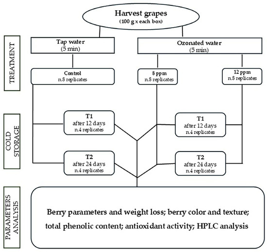 This study aimed to investigate the effect of ozonated water with different ozone doses (8 ppm and 12 ppm) on the color and textural parameters, phenolic content, and antioxidant activity of ready-to-eat Italian ‘Regal seedless’ grapes. Previously, Caponio [26] also investigated the effects of these treatments on grey mold and the berry microbiome.