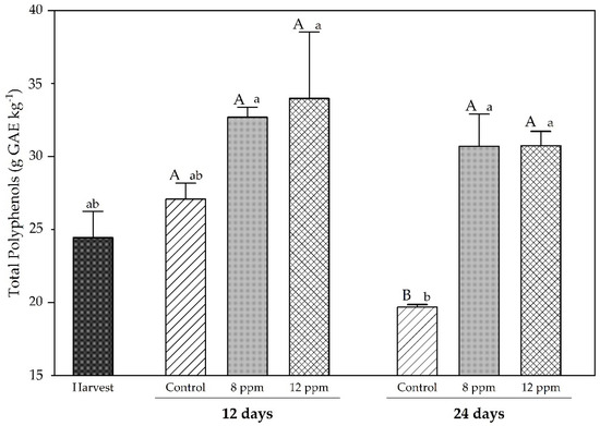 Total phenolic content of ‘Regal seedless’ grapes treated with ozonated water at 8 ppm and 12 ppm on two sampling dates (12 and 24 days) during cold storage. Vertical bars represent the standard error of the means (n = 4). Means followed by different letters, with uppercase for treatments and lowercase for time, are statistically different according to Tukey’s test at p ≤ 0.05.