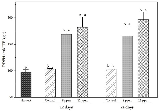 Antioxidant activity of ‘Regal seedless’ grapes, measured by the DPPH test, after treatment with ozonated water at 8 ppm and 12 ppm on two sampling dates (12 and 24 days) during cold storage. Vertical bars represent the standard error of the means (n = 4). Means followed by different letters, with uppercase for treatments and lowercase for time, are statistically different according to Tukey’s test at p ≤ 0.05.