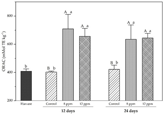 Total antioxidant activity (TAC) was assessed using the DPPH and ORAC methods. Figure 3 illustrates the total antioxidant activity expressed as DPPH radical scavenging capacity (mM TE kg−1) in grape berries treated with ozonated water at 8 ppm and 12 ppm during storage for 12 and 24 days, compared to the control.