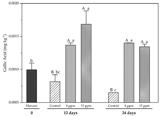 Gallic acid content of ‘Regal seedless’ grapes treated with ozonated water at 8 ppm and 12 ppm on two sampling dates (12 and 24 days) during cold storage. Vertical bars represent the standard error of the means (n = 4). Means followed by different letters, with uppercase for treatments and lowercase for time, are statistically different according to Tukey’s test at p ≤ 0.05.