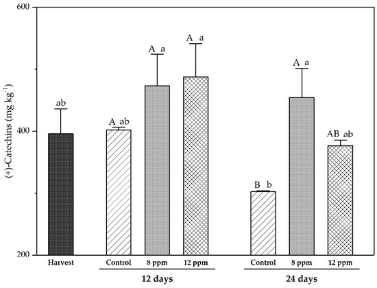 Regarding catechins, after 12 days, the control did not significantly differ from the value at harvest. Although the treatments at 8 ppm and 12 ppm showed a slight increase in values compared to the control, they did not demonstrate any significant difference. At 24 days, the control exhibited a significant reduction in catechins compared to both the treatments and the value at 12 days (Figure 6).