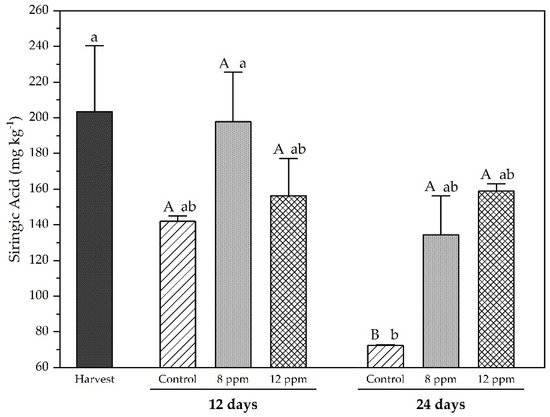 Syringic acid of ‘Regal seedless’ grapes treated with ozonated water at 8 ppm and 12 ppm on two sampling dates (12 and 24 days) during cold storage. Vertical bars represent the standard error of the means (n = 4). Means followed by different letters, with uppercase for treatments and lowercase for time, are statistically different according to Tukey’s test at p ≤ 0.05.