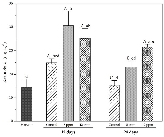 Kaempferol of ‘Regal seedless’ grapes treated with ozonated water at 8 ppm and 12 ppm on two sampling dates (12 and 24 days) during cold storage. Vertical bars represent the standard error of the means (n = 4). Means followed by different letters, with uppercase for treatments and lowercase for time, are statistically different according to Tukey’s test at p ≤ 0.05.