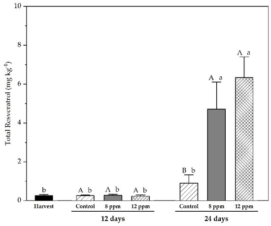Total resveratrol of ‘Regal seedless’ grapes treated with ozonated water at 8 ppm and 12 ppm on two sampling dates (12 and 24 days) during cold storage. Vertical bars represent the standard error of the means (n = 4). Means followed by different letters, with uppercase for treatments and lowercase for time, are statistically different according to Tukey’s test at p ≤ 0.05.