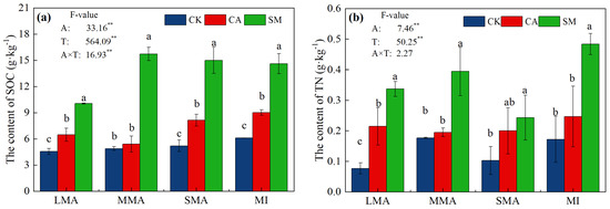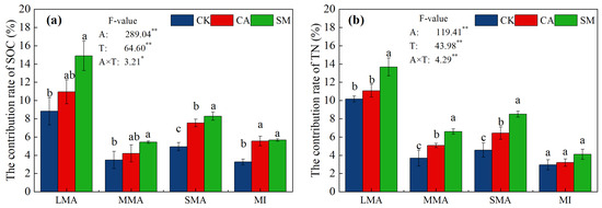 Compared to CK, the rate of contribution of SOC and TN in the soil aggregates of CA and SM all tended to increase in all size fractions (Figure 2). The differences between SM and CK were all significant except for the rate of contribution of the MI to the TN, and the differences between CA and CK were both significant in SMA (p < 0.05). With the decrease in the size of soil aggregates, the rate of contribution of the SOC and TN in all the treatments decreased first, increased, and then decreased. The rates of contribution of the SOC and TN were highest in LMA.