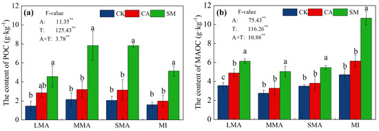 The contents of POC and MAOC in the soil aggregates of CA and SM all increased in all size fractions. The differences between SM and CK were all significant, and the differences in the content of MAOC between CA and CK in LMA were significant (p < 0.05) (Figure 3). An analysis of the contents of the two components of SOC in the same size fractions showed that the increase in POC content was primarily reflected in the MMA and SMA in the SM treatment, while the increase in the content of MAOC was primarily reflected in the MI. As the soil aggregates decreased in size, the content of POC in each treatment increased first and then decreased and reached its maximum in the MMA. The content of MAOC first decreased and then increased and reached its minimum in the MMA.