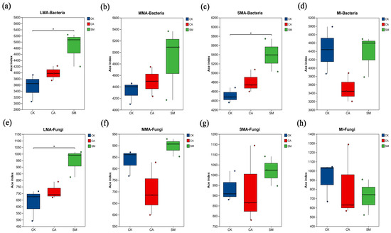 The effect of native grasses on ACE indices of microorganisms in soil aggregates in navel orange orchards in southern Jiangxi, China. Note: Box plots display ACE indices of bacterial species in LMA (a), MMA (b), SMA (c), and MI (d) and of fungal species in LMA (e), MMA (f), SMA (g), and MI (h). Significant differences are indicated by * (p < 0.05). CK (clear tillage), CA (intercropping Centella asiatica (L.) Urban), SM (intercropping Stellaria media (L.) Cvr.), LMA (large macro-aggregates, >2 mm), MMA (medium macro-aggregates, 1–2 mm), SMA (small macro-aggregates, 0.25–1 mm), MI (micro-aggregates, <0.25 mm).