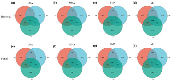 Compared with CK, whether bacterial or fungal, the ACE index of CA and SM increased in the LMA (Figure 4). The differences between SM and CK in the LMA were all significant (p < 0.05). The Chao 1 and Shannon indices of the bacteria and fungi of SM increased significantly in the LMA (Tables S2 and S3). Compared with CK, the numbers of OTUs in the bacteria of CA and SM increased in the LMA and SMA (Figure 5). In addition, the numbers of fungal OTUs of CA primarily increased in the MI, while those of SM primarily increased in the LMA.
