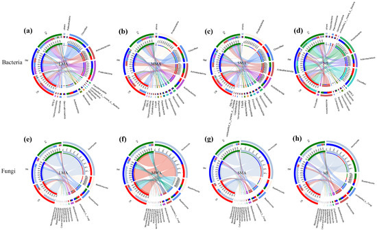 The effect of native grasses on microbial community structure in soil aggregates in navel orange orchards in southern Jiangxi, China. Note: Circos plots display the composition and relative abundance of bacterial communities in LMA (a), MMA (b), SMA (c), and MI (d) and of fungal communities in LMA (e), MMA (f), SMA (g), and MI (h). CK (clear tillage), CA (intercropping Centella asiatica (L.) Urban), SM (intercropping Stellaria media (L.) Cvr.), LMA (large macro-aggregates, >2 mm), MMA (medium macro-aggregates, 1–2 mm), SMA (small macro-aggregates, 0.25–1 mm), MI (micro-aggregates, <0.25 mm).