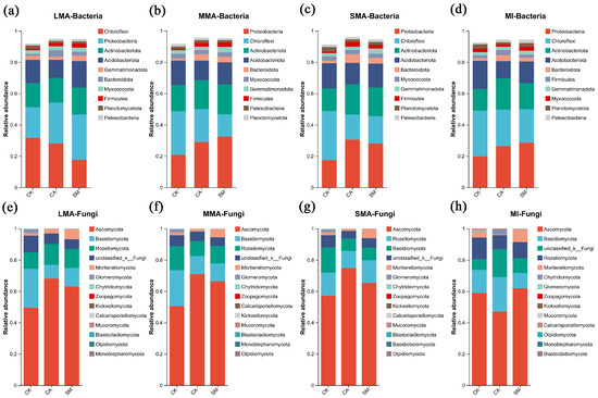 The effect of native grasses on microbial community composition and relative abundance in soil aggregates in navel orange orchards in southern Jiangxi, China. Note: The community bar charts display the composition of bacterial species and the proportions of different species in LMA (a), MMA (b), SMA (c), and MI (d) and of fungal species in LMA (e), MMA (f), SMA (g), and MI (h). CK (clear tillage), CA (intercropping Centella asiatica (L.) Urban), SM (intercropping Stellaria media (L.) Cvr.), LMA (large macro-aggregates, >2 mm), MMA (medium macro-aggregates, 1–2 mm), SMA (small macro-aggregates, 0.25–1 mm), MI (micro-aggregates, <0.25 mm).