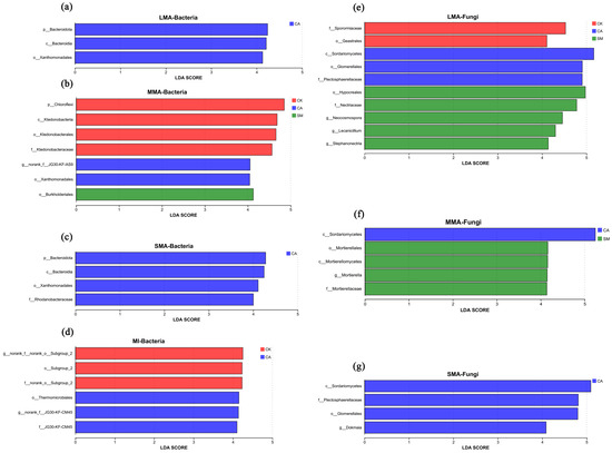 The effect of native grasses on LEfSe analysis of microbial genera in soil aggregates in navel orange orchards in southern Jiangxi, China. Note: LDA discriminant plots display the LDA values of different bacterial species with distinct differences in LMA (a), MMA (b), SMA (c), and MI (d) and of different fungal species with distinct differences in LMA (e), MMA (f), and SMA (g). The effect size LDA score between treatments is >4. CK (clear tillage), CA (intercropping Centella asiatica), SM (intercropping Stellaria media), LMA (large macro-aggregates, >2 mm), MMA (medium macro-aggregates, 1–2 mm), SMA (small macro-aggregates, 0.25–1 mm), MI (micro-aggregates, <0.25 mm).