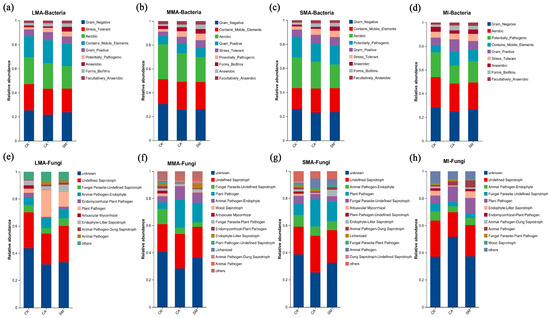 The effect of native grasses on prediction of bacterial phenotypic function based on BugBase and prediction of fungal phenotypic function based on FUNGuild in soil aggregates in navel orange orchards in southern Jiangxi, China. Bar charts display bacterial BugBase phenotype predictions in LMA (a), MMA (b), SMA (c), and MI (d), and bar charts of FUNGuild display the functional classification of fungi and the abundance information of each functional classification in LMA (e), MMA (f), SMA (g), and MI (h). Note: CK (clear tillage), CA (intercropping Centella asiatica (L.) Urban), SM (intercropping Stellaria media (L.) Cvr.), LMA (large macro-aggregates, >2 mm), MMA (medium macro-aggregates, 1–2 mm), SMA (small macro-aggregates, 0.25–1 mm), MI (micro-aggregates, <0.25 mm).