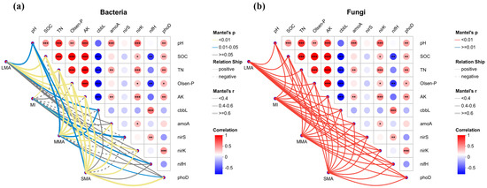 The effect of native grasses on Mantel test analysis of microbial communities and environmental factors and functional genes in soil aggregates in navel orange orchards in southern Jiangxi, China. Note: (a) Mantel test network heatmap displayed the correlation between environmental factors and bacterial community structure. (b) Mantel test network heatmap displayed the correlation between environmental factors and fungal community structure. The lines in the figure represent the correlation between communities and environmental factors, while the heatmap represents the correlation between environmental factors. Line thickness: the correlation between the community and environmental factors, plotted using Mantel’s r (absolute value of R). Line color: different Mantel’s p values. In the heatmap, different colors represent positive and negative correlations, and the depth of colors represents the magnitude of positive and negative correlations. The stars in the color blocks represent significance with * (0.01 < p ≤ 0.05), ** (0.001 < p ≤ 0.01), and *** (p ≤ 0.001). CK (clear tillage), CA (intercropping Centella asiatica (L.) Urban), SM (intercropping Stellaria media (L.) Cvr.), LMA (large macro-aggregates, >2 mm), MMA (medium macro-aggregates, 1–2 mm), SMA (small macro-aggregates, 0.25–1 mm), MI (micro-aggregates, <0.25 mm).