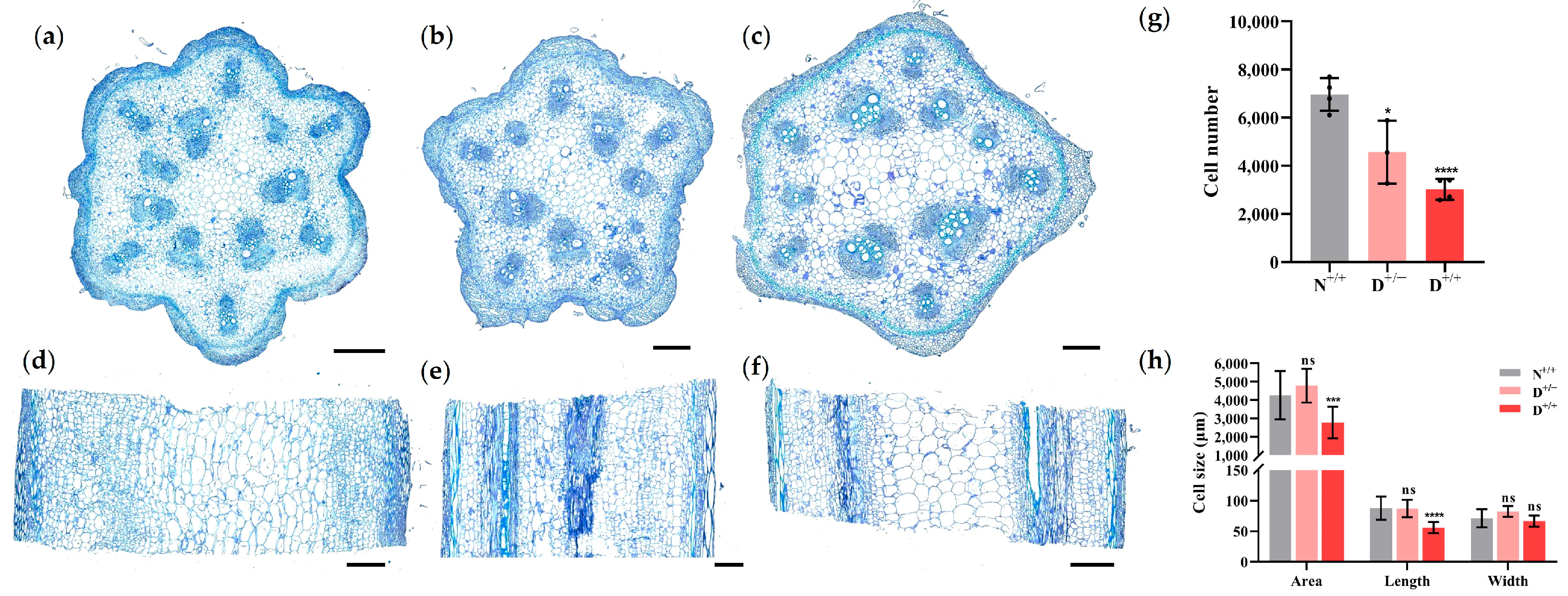 Cytological observation of internodes. (a–c) Transverse sections of the internodes of N+/+ plants (a), D+/− plants (b), and D+/+ plants (c). (d–f) Longitudinal sections of the internodes of N+/+ plants (d), D+/− plants (e), and D+/+ plants (f). (g) Statistical analysis of cell number. (h) Statistical analysis of cell size. Scale bar: 500 μm. ns: non-significant; * significant at p < 0.05; *** significant at p < 0.001; **** significant at p < 0.0001.