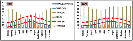 where Kc is Crop factor (FAO-56, FAO 56 [43]); ETO is Reference evapotranspiration in mm/day (Figure 3); and IRg is Gross irrigation requirements in mm/day. The Keller equation’s estimated ground reduction factor Kr and Kr values were as follows: (1 − GC%) Kr = GC% + 0.15, where the amount of shade per plant/amount of plant ground cover (%GC); Efficiency of irrigation (Ei), % R is the amount of water a plant receives from sources besides irrigation (for example, rainfall) in millimeters (mm); and LR is the amount of water required for salt leaching in millimeters. For seasons 2021 and 2022, the total water volumes were 7600 m3/ha/season and 7560 m3/ha/season, respectively.