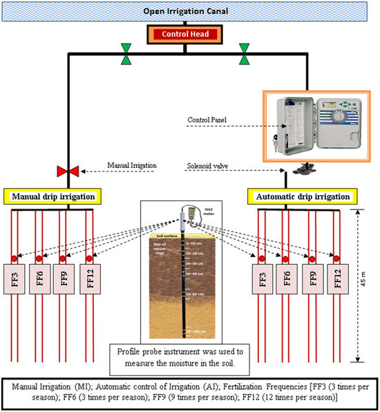 Three replicates of a split plot design were used to set up the experiment. The main plots included manual irrigation (MI) and automatic control of irrigation (AI). Four methods for scheduling mineral fertilization frequencies, i.e., and FF3—three times per season; FF6—six times per season, FF9—nine times per season, FF12—12 times per season, were applied to the sub-main plot, as shown in Figure 4 and Table 2. The distribution of the number of fertilization times during the period from flowering to production was once every month.