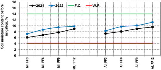 Figure 6 shows that the values of SMC just before irrigation were higher with the application of automatic control in the irrigation process compared to manual irrigation. This may have been due to the accuracy of the automatic irrigation, which maintained a regular addition of irrigation water at specific times according to the automatic control panel, i.e., as no intervention was required, there were no errors due to the human element.