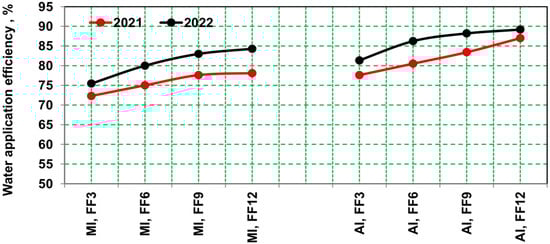 When discussing the water application efficiency (WAE), it is important to note that it refers here to the water requirements of lemon plants, whereby the real amount of irrigation water that is held in the root zone is expanding. The authors of [44] applied Equation (2) to determine WAE: