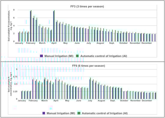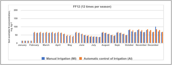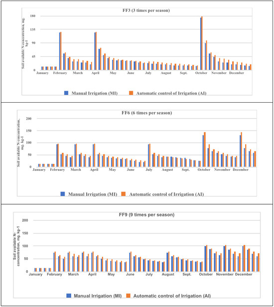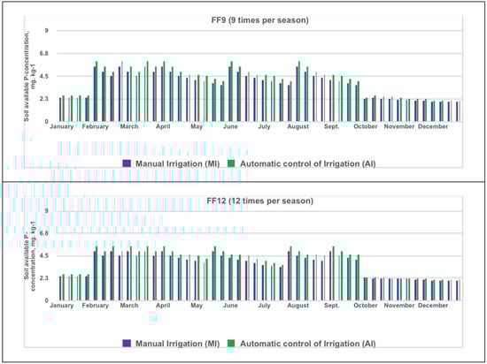 The effect of automatic irrigation and the frequency of fertilization application on the concentration of macronutrients was studied, as demonstrated by the data presented in Figure 8, Figure 9 and Figure 10.