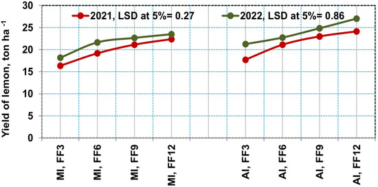 Effect of automatic control of irrigation and fertilization frequency on the yield of lemon during the 2021 and 2022 seasons.