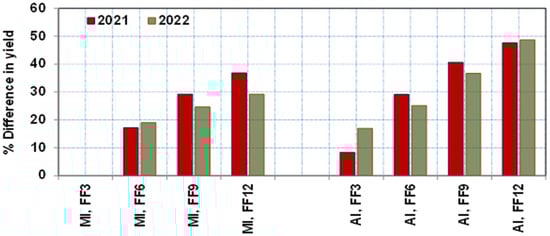 Figure 11 and Table 4 show that the highest LY values were recorded when adding irrigation water with automatic control and when applying fertilizers 12 times during the growing season instead of only three times.