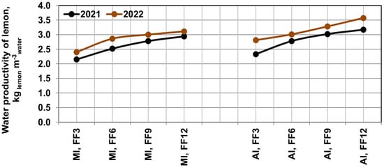 Effect of the automatic control of irrigation and fertilization frequency on the water productivity of lemon during the 2021 and 2022 seasons.