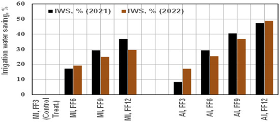 The effect of automatic irrigation and the frequency of fertilization application on irrigation water savings was studied, as demonstrated in Figure 14.
