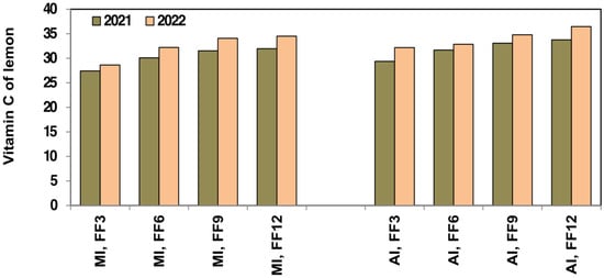 Effect of the automatic control of irrigation and fertilization frequency on the vitamin C content of lemon during the 2021 and 2022 seasons.