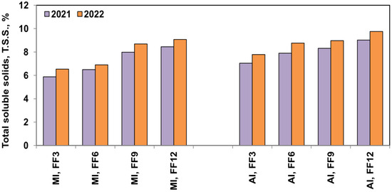 Effect of the automatic control of irrigation and fertilization frequency on the total soluble solids of lemon during the 2021 and 2022 seasons.
